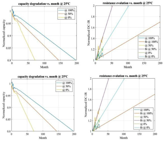 El Ghossein et al. [14] performed an accelerated aging investigation on LICs over a 20-month period at elevated temperatures (60 °C and 70 °C) and varying voltage levels (2.2, 3, and 3.8 V, corresponding to 0, 50, and 100% SOC, respectively). They did not, however, offer any model that could foretell the end of the life of the batteries at these temperatures. Soltani et al. [10] studied a thorough life model for LIC 2300F batteries that could forecast the end of life (EOL) for calendar life tests at various temperatures. In this model, the lifetime was examined in relation to several stress factors, such as temperature, storage time, and the SOC. The capacity and internal resistance progression of the LIC utilized for the calendar life test are depicted in Figure 6.