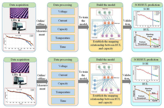 In this section we will explore the model-based and data-driven RUL prediction approaches for Li-ion batteries. We can categorize these into two groups by creating mathematical models to depict the relationship between the battery features and influences. These models also focus on analyses of the process of predicting Li-ion battery life decline. For the purpose of predicting the RUL of batteries, Wang and Zhang et al. [32,33] created the particle filter (PF) approach. The PF approach and the Dempster–Shafer theory were utilized by Lucu et al. [34] to calculate the battery capacity decline. For the purpose of predicting the RUL of batteries, Xu et al. [35] combined logistic regression and Gaussian process regression models. The authors of [36] used odorless Kalman filters for the prediction of the RUL of batteries. The application of various filtering methods for predicting the RUL of lithium-ion batteries can reduce the influence of noise on the prediction results and obtain a reliable prediction accuracy. In contrast, electrochemical models offer higher accuracy and reliability than methods based on statistical analysis and allow for a detailed study of several aspects of the physical properties inside the battery. A particle filtering (PF) based structure has been demonstrated by Liu et al. [37] for predicting the RUL of LIBs and a particular electrochemical model has also been demonstrated. A specially created current excitation can be utilized to identify the parameters of the simplified electrochemical model (SEM), which are employed as state variables in the PF algorithm. As shown in Figure 7, the observational equation in the PF algorithmic framework is based on the SEM-based capability simulation procedure. When predicting RUL, this method fully considers the battery’s mechanism.