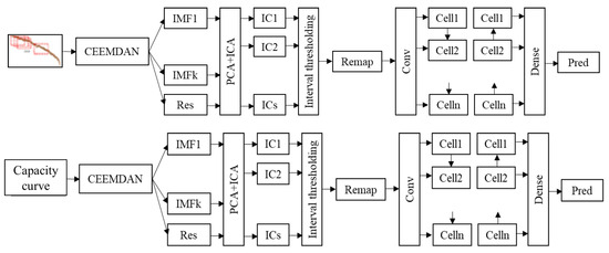 The prediction of LIHC lifetime decline is a complex task, and many factors need to be considered. Various methods based on physical models and data-driven methodologies, similar to Li-ion battery and supercapacitor lifetime prediction methods, have been developed throughout the years. However, due to the lack of a deep understanding of the aging principle of Li-ion capacitors and insufficient experimental data for data training, these two relatively mature prediction methods are not easy to achieve in the field of life prediction for lithium-ion capacitors. Based on this, Li et al. [48] suggested a multi-state joint estimation approach. The effect of temperature on important LIHC parameters was investigated. The dynamic characteristics of LIHCs were described using the first-order resistance-capacitance equivalent circuit model. The polymorphism and LIHC parameter coupling relationship was deduced. To update model parameters adaptively, the recursive least squares algorithm with a variable forgetting factor (VFF-RLS) was utilized. Then, an artificial neural network model with long- and short-term memory (LSTM) and an ampere-hour integration approach were utilized to correct the open circuit voltage (OCV) of the online recognition. The estimation of the state of charge (SOC), remaining useable energy (RUE), and energy state (SOE) under dynamic operating conditions was obtained throughout a large temperature range, allowing for the development of a physical model for Li-ion capacitor lifetime prediction. The data used in this approach were based on FUDS and DST tests performed at 10 °C, 25 °C, and 50 °C. In addition, the cycle life test in the literature [49] was conducted on commercial off-the-shelf (COTS) LIC batteries sourced from three different manufacturers and applied to the LIC life cycle prediction model developed for EDLC in previous work. The activation energy of the deterioration rate was estimated using the Arrhenius equation based on the capacitance retention trend, and the aging acceleration factor was determined. The calculated acceleration factor varies from manufacturer to manufacturer, suggesting that the appropriate burn-in acceleration factor for each manufacturing unit should be determined based on cycle life tests, rather than simply applying the accepted rules of thumb for LIBs and EDLCs. Soltani et al. [10] proposed a lifetime model, which can predict the EOL of batteries stored or applied in cycles at different temperatures. This model can depict the increase in resistance caused by aging, which is extremely valuable in the design of thermal management systems. Cycle and calendar aging effects are separated in this model by employing two independent capacity degradation lookup tables and two independent internal resistance growth lookup tables. Yang et al. suggested an RUL prediction approach for LICs based on the data-driven method. The framework is shown in Figure 10. In contrast to earlier techniques, the proposed network will be trained using the de-noised data, which will enable the network to learn information from the time series.