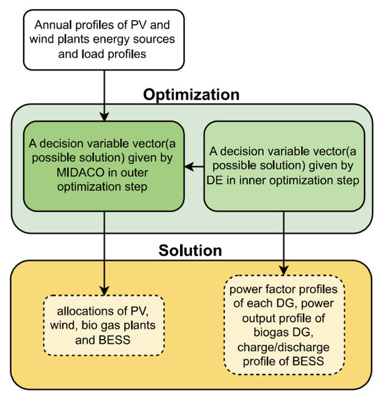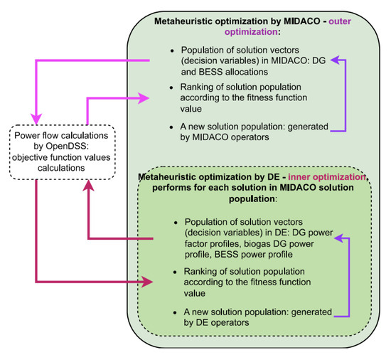 The details of the interactions between outer and inner optimizations are shown in Figure 6. For each individual solution in the MIDACO solution population, the optimization of the DG power factor profiles, biogas power profile, and BESS power profile is optimized by DE in the inner optimization. The parameters of the tools used in this step of the procedure (Step 1: optimization) are