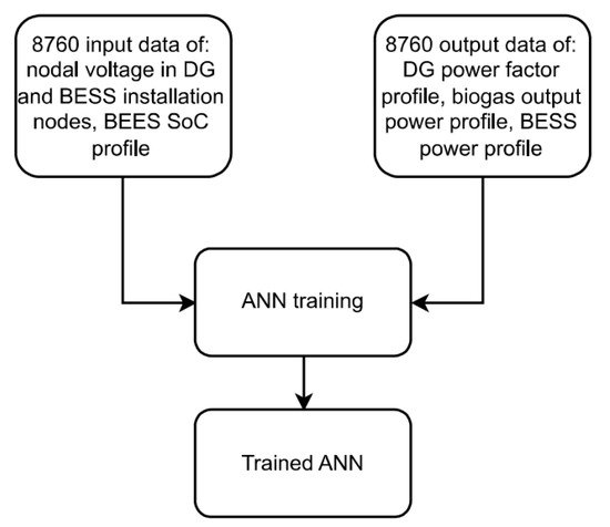 where and are decision variable vectors of outside and inside optimization levels, respectively; , , and are rated apparent powers (sizes) of PV, wind, and biogas plants; and are rated capacity (size) and power of BESS; , , , and are locations of the PV, wind, biogas plants, and BESS, respectively; , , and are phase shifts between voltage and current (defining power factors) of the PV, wind, and biogas plants, respectively; and and are load shape values of the biogas plant and BESS for the period . The optimization procedure is carried out using the input data from PV and wind power plants and the load profiles of the consumers. These load profiles are usually estimated based on historical data using developed estimation and forecasting methods. However, after the installation of DG and BESS in the distribution network, the real data of DG generation and consumer load profiles may differ from those used for optimization in the planning phase of the DG and BESS installation project. This means that the optimal profiles of DG and BESS determined in the planning phase may not be as well matched with the different input data. ANN is used to control the power profiles of the controllable DG and BESS to solve this problem after DG and BESS are installed in the power distribution network. The inputs to ANN are the node voltages of the busses where DG and BESS are installed, and the outputs of ANN are the decision variables of the internal optimization (i.e., the power and power factor profiles of DG and BESS). After training ANN with the data obtained during the optimization procedure, the learned ANN is used to estimate the optimal profiles of DG and BESS in case the data differ from those used in the optimization in the previous step of the procedure. The ANN structure used in this study is shown in Figure 2. The whole developed and proposed framework, based on cosimulation, two-step optimization, and ANN prediction (Figure 3), was implemented in the Python programming environment. A schematic overview of the developed framework is given in Figure 4.