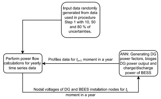 After determining the optimal allocation of DG and BESS (in process Step 1) and training ANN to generate optimal profiles of the power factors of DGs, biogas production profile, and BESS profile (in procedure Step 2), the developed method is tested/verified in procedure Step 3 with input data different from those used in the previous two steps in the allocation optimization and training of ANN. The input data for this procedural step are generated by generating random numbers with different uncertainty ranges over the input data values according to the uniform distribution. The applied uncertainties for generating random input data were 10%, 50%, and 80% of the input data values used in procedure Steps 1 and 2. An overview of the procedure in Step 3 is shown in Figure 8.
