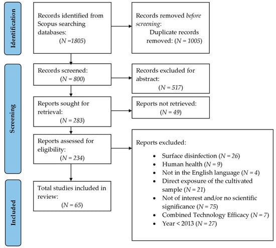 A systematic review of the use of ultraviolet radiation as a sterilising agent to improve air quality was carried out in accordance with the PRISMA guidelines []. As is well known, this method of reviewing the open literature is proposed to ensure exhaustive research, clearly delimited by the defined inclusion and exclusion criteria, and to provide an impartial and objective analysis for conclusive findings, avoiding bias.