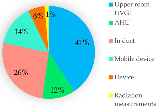 Nunayon et al. [] compared the disinfection efficacy of a novel UR-UVGI-LED system with a conventional UR-UVGI-MV system. UV irradiance measurements and bioaerosol sampling were performed. The results show the potential advantages of UR-UVGI-LED systems.