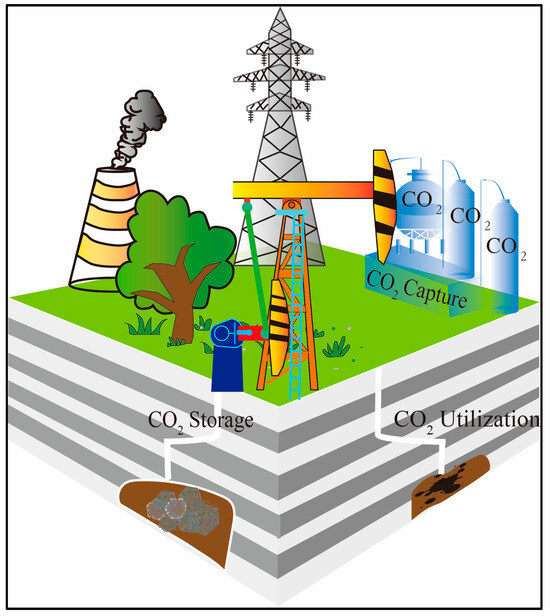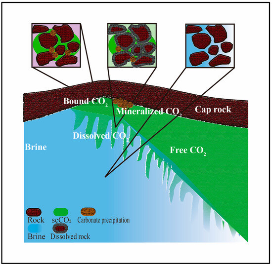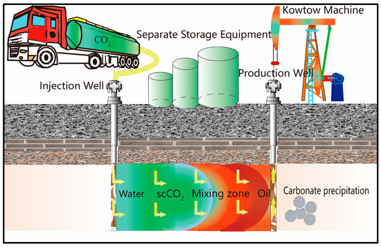 Currently, oil fields such as Daqing and Shengli are in the developmental phase; they are characterized by low permeability and a high water cut and present challenges in their operation [17,18,19]. Injecting carbon dioxide into oil reservoirs has been shown to enhance the recovery rate while securely sequestering carbon dioxide [20,21,22]. Figure 3 illustrates the schematic diagram of carbon dioxide geological sequestration. This technology has a double effect in fostering economic development and contributing to environmental protection. Therefore, CO2 mineralization in an underground reservoir environment is considered to be one of the most promising and safe methods for reducing CO2 emissions.