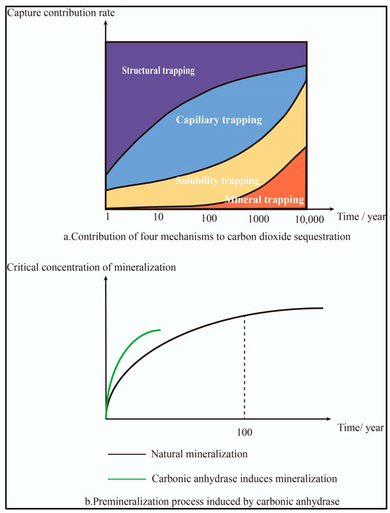 Excessive emissions of greenhouse gases such as carbon dioxide have caused global temperatures to rise [1]. According to six major international datasets integrated by the World Meteorological Organization (WMO), the world’s average temperature in 2021 is about 1.11 (±0.13) °C above pre-industrial levels (1850–1900) [2,3,4]. During the meeting of the United Nations General Assembly in September 2020, the Chinese government outlined its 2030 “carbon peak” and 2060 “carbon neutrality” goals in response to the global climate crisis [5]. Carbon dioxide capture, sequestration, and utilization (CCUS) are recognized as critical and viable means of achieving carbon neutrality and mitigating the greenhouse effect [6,7,8], as illustrated in Figure 1. Carbon dioxide sequestration represents a pivotal aspect of CCUS technology; primarily, it involves the injection of captured carbon dioxide into deep geological formations and storing it in geological bodies such as saline aquifers [9], depleted oil and gas reservoirs, and unexploited coal seams [10,11] through geological structures, capillary force binding, dissolution, and mineralization [12,13,14]. Among the four main sequestration methods, mineralization sequestration involves reacting carbon dioxide with minerals in the rock layer to create a stable secondary mineral and then permanently storing it in the form of solid carbonate. Mineralized sequestration is considered the most secure and stable method for carbon sequestration due to its durability and the safe and stable storage of the products. Achieving mineralized sequestration through natural forces alone typically requires at least a century [15], as shown in Figure 2. Consequently, how to accelerate the mining process with the assistance of microorganisms has become a research hotspot. This paper comprehensively reviews the metabolic mechanism of microbial-induced mineralization, the historical research, the action sites, and the mechanisms of the key enzyme, carbonic anhydrase, in mineralization induction. Additionally, it addresses the existing challenges and prospects.