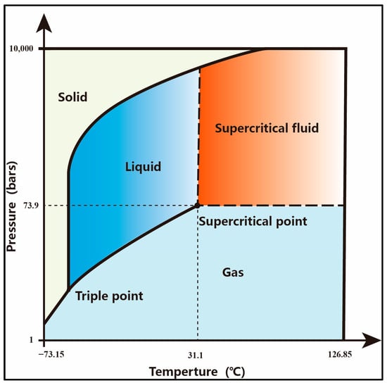 Carbon dioxide mineralization in the reservoir belongs to in situ wet carbonation. During the process of carbon dioxide injection into the target layer (usually at a depth of 800–3000 m), both the temperature and the pressure exceed the critical point of the carbon dioxide phase diagram (31.1 °C and 73.9 bars), as shown in Figure 4, and the carbon dioxide is in a supercritical state [26].