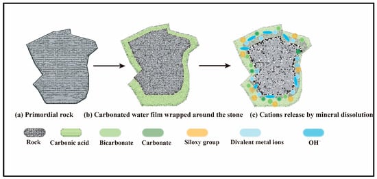 The surfaces of clay minerals, carbonate minerals, and feldspar mineral particles are enveloped by a carbonate water film. This film leads to the leaching of alkaline earth metal ions such as calcium, magnesium, and iron, resulting in the acquisition of Ca2+, Mg2+, Fe2+, OH−, HCO3−, CO32−, and Si-O groups [37]. The mineral dissolution process is depicted in Figure 6, and the reaction equations are presented below: