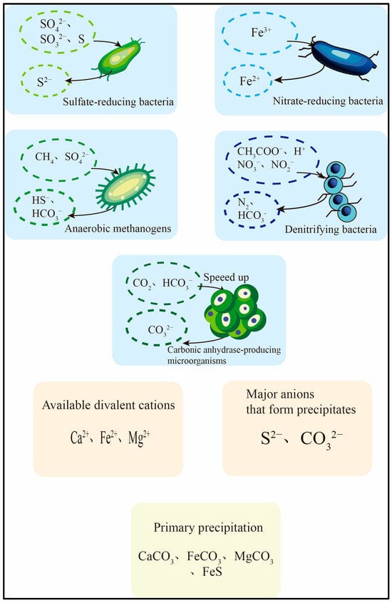 Microorganisms play critical roles in elemental cycling, as well as in the transformation of metals and minerals, decomposition, and the formation of soil and sediment [65]. Reservoirs act as natural geological bioreactors [66], harboring a diverse array of microorganisms, which primarily include fermenting bacteria, sulfate-reducing bacteria, nitrate-reducing bacteria, iron-reducing bacteria, methanogens, etc. [67]. These microorganisms are directly or indirectly involved in the nucleation, crystallization, and growth processes of minerals during mineral formation. Academics classify the microbial involvement in mineralization into two main categories based on the mode of microbial action: microbial-induced mineralization and microbial-controlled mineralization. Microbial-controlled mineralization refers to the process in which microbial cells and metabolic products are directly involved in the carbonation process, resulting in microbial minerals with distinctive properties. On the other hand, microbial-induced mineralization involves microbes altering the local microenvironment through metabolic activities, creating physicochemical conditions that are conducive to mineral precipitation and thus lead to the formation of induced microbial minerals. The process of microbial-assisted carbon dioxide mineralization in the in situ environment of oil reservoirs is considered a microbial-induced process. As early as 1973, Boquest et al. isolated 210 strains of Proteus vulgaris from soil microorganisms, demonstrating the ability to induce calcium carbonate precipitation generation through metabolic activities [68]. Subsequently, numerous experiments have highlighted the fact that microbial-induced mineralization is mainly achieved through metabolic activities [69], such as urea hydrolysis [70,71], denitrification [72,73], trivalent iron reduction [74], sulfate reduction [75], and organic matter degradation. Table 2 lists the main microorganisms involved in mineralization.