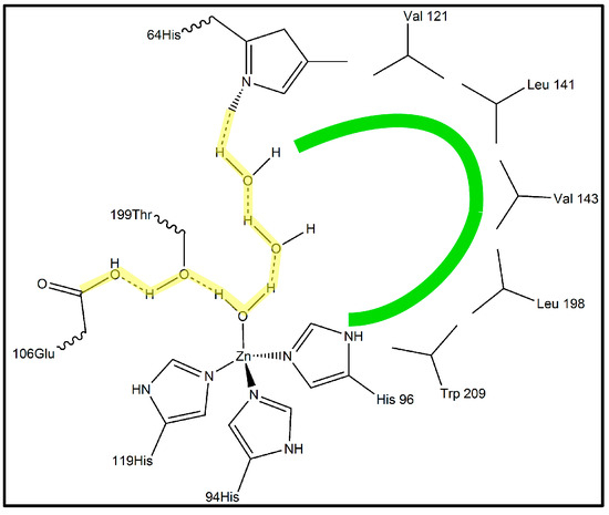 Active region structure of carbonic anhydrase [105]. Yellow represents the proton transport chain and green represents the hydrophobic pocket.