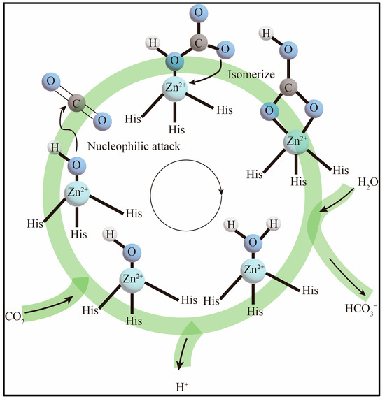 A large number of studies have revealed the structure of α-CA with zinc as the active center and have provided insights into its catalytic mechanism [95,97,99,110]. During its active state, carbonic anhydrase readily binds to to form . Subsequently, launches a nucleophilic attack on the carbon atom of the carbon dioxide molecule surrounded by a hydrophobic pocket and combines to form . Later, the water molecule reacts with the zinc bicarbonate, . Once the bicarbonate is displaced into the solution, the enzyme is inactivated as it combines with water to produce . The catalytic process of carbonic anhydrase is illustrated in Figure 10.