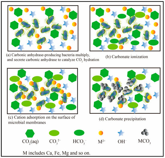 Overall, carbonic anhydrase-producing bacteria grow and multiply in the reservoir environment and secrete carbonic anhydrase to catalyze carbon dioxide hydration, thus promoting the conversion between carbon dioxide and bicarbonate and carbonate and increasing the CO32− concentration in the formation water. Meanwhile, carbonic acid formed by carbon dioxide hydration dissolves minerals such as silicates, releasing divalent cations, which are adhered to the surface of microbial membranes through electrostatic forces. Eventually, the cations combine with locally oversaturated carbonate ions, culminating in carbonate precipitation, and thereby achieve the solid-state mineralization of carbon dioxide. The process of carbonate deposition induced by carbonic anhydrase-producing microorganisms is shown in Figure 11.
