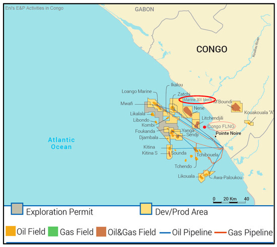 The building of production platforms and completion drilling operations for over 30 wells have been finalised, with a production rate of more than one hundred and forty thousand barrels of crude oil equivalent per day (boe/d) expected. The first phase’s production capacity is 7500 boe/d, which will be gathered from a platform that has been specifically designed for this purpose. Following that, the oil is transported to the Zatchi production platform, where it is processed via an undersea pipeline that extends over almost 17 km. It was discovered that the Nene Marine 3 well was capable of producing more than five thousand oil barrels per day and its density was 36 degrees API during the production test. This is another significant achievement for the operator in the Congo Basin. The operator (ENI) of the Nene Marine field has identified resources in the Congolese Marine XII Block that are estimated to be worth around 3.5 billion barrels of oil equivalent [10].