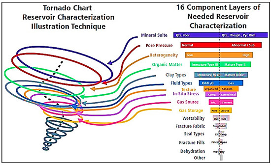 The components of each of these levels may be characterised using the many characterisation sidebars that are included within each of these layers. In addition, the use of many sidebars may boost one’s level of confidence and reduce the reservoir and completion quality’s characterization risk, which is connected to each component of a reservoir’s characterization layer. The tornado chart and sidebars methodology represents a comprehensive, data-driven approach for performance analysis, featuring measurable indices that are applied in order to measure and geographically describe the reservoir and completion quality components, as shown in Figure 4. For each individual layer included in this characterisation and profiling approach, there is a particular index example that can be accessed. Among them are the interpretation and integration of the foundational data sets that are necessary for these procedures. Figure 4 presents a tornado chart and accompanying sidebar, which together constitute a detailed stratified reservoir characterization method used to assess petroleum system processes through the comparison of layered primary indices [21].