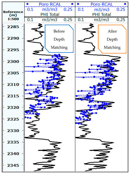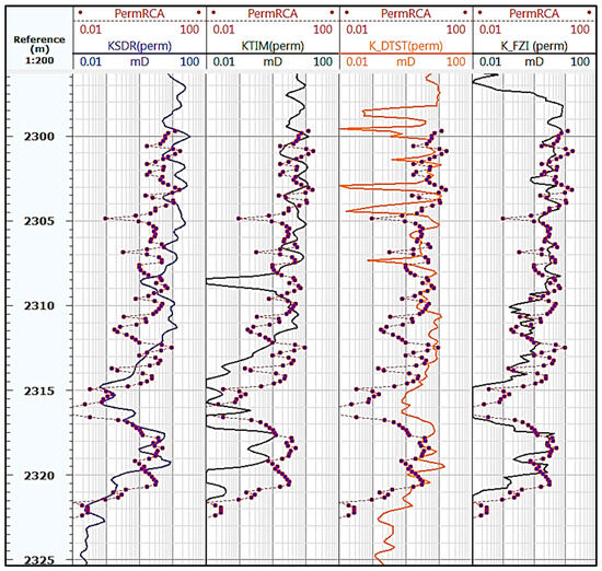 The IMF is calculated by adding up the volume-weighted IMF values for all of the different minerals included in the model. We computed the index matching factor for each depth using Equation (10) so that we could have the best possible match between the core permeability and the permeability index. This was carried out so that we could obtain the greatest possible fit.