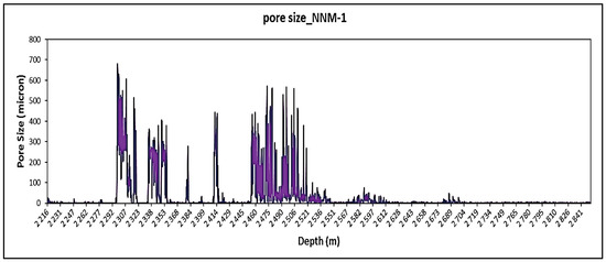 Calculations of the pore size distribution in each of the five accessible wells were made using the approach that was just presented. Figure 16 provides an decpiction of the computed pore size values for the well NNM-1.