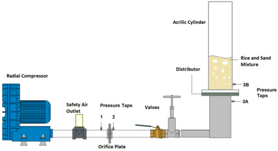 The system used to conduct the cold fluidization experiments is shown in Figure 1. An atmospheric bubbling fluidized bed was designed by the LC3 research group. The system is composed of an acrylic fluidized bed, and a radial compressor (an Ibram CR8 with 7.5 hp), which can reach a maximum flow of 8 m3/min and 39.2 kPa of maximum manometric pressure. Flow measurements were performed using an orifice plate with an orifice diameter of 16.93 mm, and pressure measurements were collected before (pressure tap 1) and after (pressure tap 2) the orifice plate experiments. Pressures were obtained from pressure taps 1, 2, 3A and 3B, depicted in Figure 1. All the pressure measurements, including the ones used for flow calculations, were carried out using an Arduino Due (Arduino, Italy) system integrated with BMP280 Bosch sensors (Bosch, Germany) designed by the authors specifically for measuring pressure variations in fluidized bed reactors. The software used was designed specifically for such a purpose.