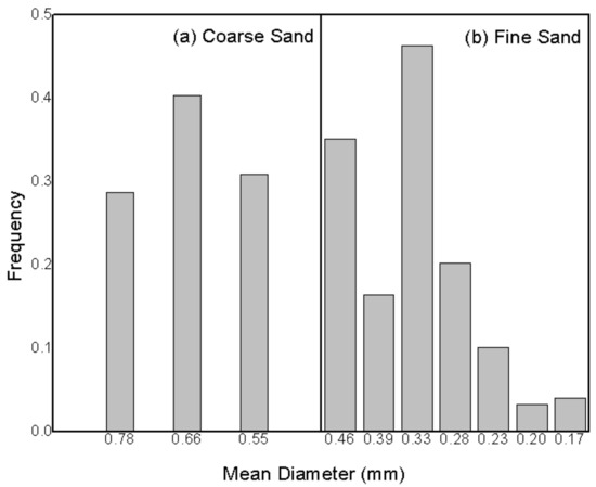 Mean diameter distribution for (a) coarse sand and (b) fine sand particles.
