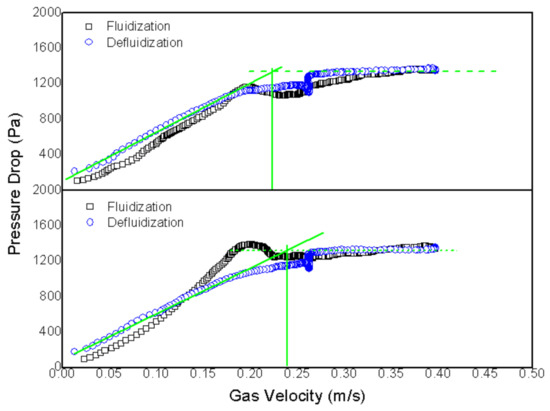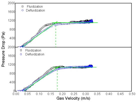 Tests were carried out to develop a bed pressure drop profile as a function of the bed fluidizing gas velocity. Thus, the minimum fluidization speed was obtained using a graphical method, as in other works such as Pécora et al. [26] and Lv et al. [24]. However, it is worth mentioning that although these works have defined Umf only through a fluidization process, there are works such as those performed by Rao and Bheemarasetti [27] and Qiaoqun et al. [13] who define this speed by performing a defluidization of particulate material. Each figure shows pressure drop profiles as a function of gas surface velocity and two fluidization and defluidization curves, thus representing the duplicate tests for each configuration of factors investigated.
