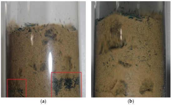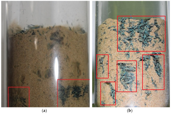 Fluidization of a mixture of 5 wt% rice husk (green) and sand with a perforated plate as distributor for 2 different mean diameters of sand: (a) 324 µm and (b) 647 µm. Stagnation regions highlighted by the red boxes.
