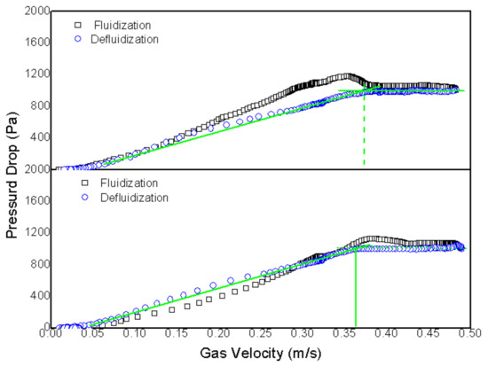 However, studies aiming to estimate minimum fluidization velocity [28,29,30] usually disregard the distributor plate in their equations. Therefore, this factor must be more extensively studied and, if the estimates are accurate, they should be included in minimum fluidization velocity predictive equations.
