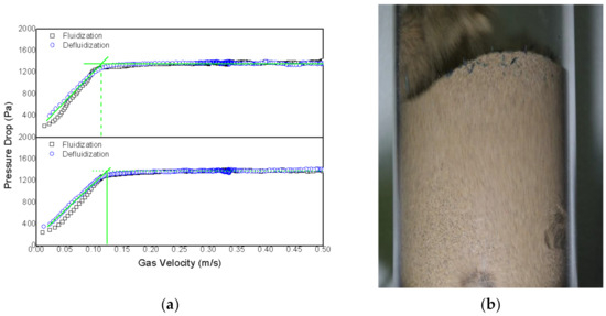 Mixture of 1 wt% rice husk and sand (324 µm) with a perforated plate: (a) minimum fluidization velocity determination; (b) fluidization of the mixture of rice husk (green) and sand.