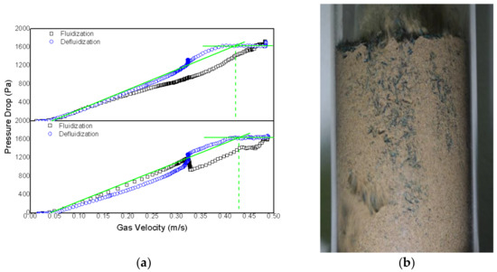 However, several preferential channels were created by setting the velocity to 1.2 Umf, and, after a few minutes, fluidization was stopped completely. As shown in Figure 7b, the formed preferential channels are indicated by red rectangles.