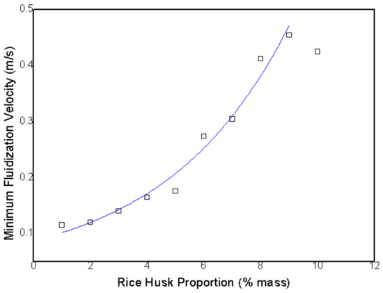 Qiaoqun et al. [13] found a greater relationship between the rice husk ratio and minimum fluidization velocity, which is similar to what has been found herein. However, the relationship found by Qiaoqun et al. [13] presents apparently linear behavior, while that found herein is closer to an exponential behavior, as observed in Figure 10.