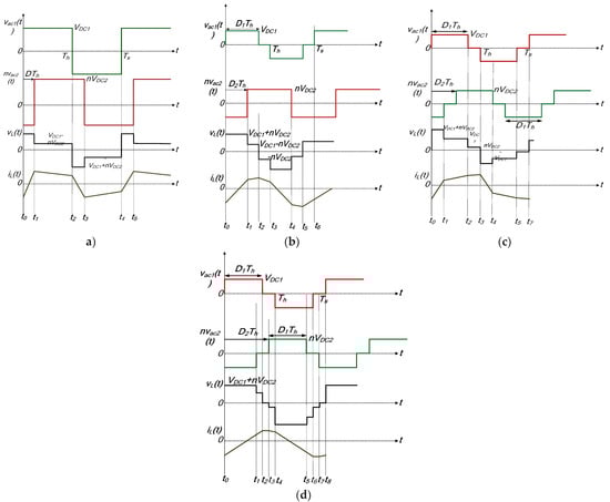 where tn represents nth switching instant; v a c 1 ( t ) is the coupling transformer primary voltage; and v a c 2 ( t ) is the secondary transformer voltage referred to the primary side. According to Figure 5a, nine different switching segments emerge that will completely be analyzed for this mode.