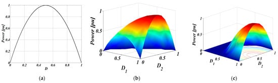 The power output for different combinations of D1 and D2 is illustrated by Figure 3c. As shown in the figure, similar to EPS control, maximum power output can be achieved for values of D1 = 1 and D2 = D = 0.5, while for partial power operation, the same output power results for different combinations of D1 and D2.