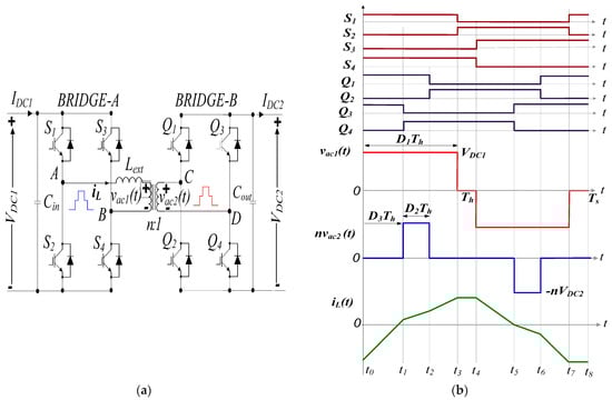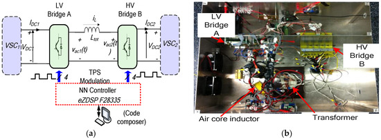 In modern power electronics circuits and systems, conversion from one level of DC voltage to another has become a norm as different circuits utilizing different voltage ratings are incorporated within the same system. DC/DC converters are the equivalent to AC transformers with a continuously variable turn ratio, a key component in various power electronic systems. Isolated bidirectional dual active bridge DC/DC converters (DAB), shown in Figure 1a, were first proposed in [1], and have recently received substantial interest due to its reduced passive components (only a single-series inductor) count, galvanic isolation, extended region of soft switching, high power density, fast power reversal, possibility of high stepping ratio of conversion, buck/boost operation, simple control methods and its integral fault isolation capability without a need for a very fast controller to limit the fault current or the blocking of the IGBT switches during the fault duration [2,3,4].