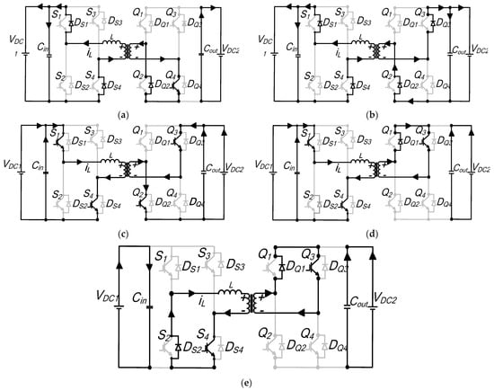 Interval t4–t4: Figure 6f shows the equivalent circuit for this duration. Switch S4 of bridge A is turned off and the current flows through the diagonal antiparallel diodes DS2 and DS3 since bridge A’s voltage is negative. The status of bridge B remains unchanged, where iL decreases linearly and is carried by Q2 and DQ4. Voltage across the inductor is −VDC1. Thus,