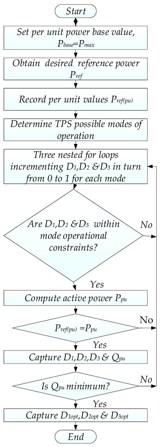 The uniqueness of this manuscript is that it shows that CPS, EPS and DPS DAB modulation control schemes are all special cases of TPS modulation [1,15,20,21,22,23,24,25]. Therefore, the study combines all known phase shift modulation schemes of DAB into TPS, instead of presenting each modulation scheme separately and differentiating TPS from CPS, EPS and DPS modulation control. The paper extends the work presented originally by author 1 in [34] by performing detailed mathematical analysis of DAB converters under TPS by identifying all the possible modes of operation under the TPS scheme for both power flow directions. It focuses on simplifying the analysis of each mode, contrary to [35], which reported TPS to be a complex scheme and with an objective to focus on standardizing all the phase shift modulation schemes for DAB DC/DC converters. An analytical assessment of each mode is performed to investigate each mode’s active power and inductor currents, the RMS current of the AC link, the RMS voltage of the AC link, the reactive power, the power range operation of the mode, and the ZVS switching possibility and reactive power. In addition, a generic optimization algorithm is developed to show the key advantages of TPS. The authors expect the detailed analysis of DAB converters performed in this manuscript to facilitate DAB DC/DC converter designers in identifying a wide range of optimization algorithms to achieve higher efficiency under TPS schemes.