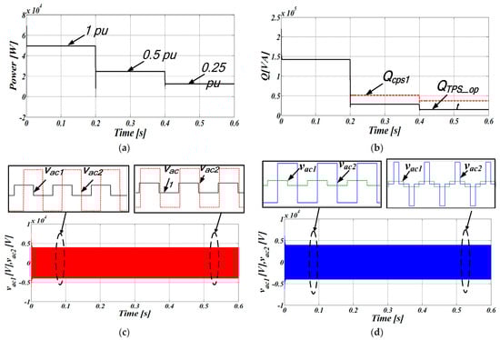 The implementation of the CPS control algorithm is straightforward, as it requires just one variable: the phase shift angle, to manage power flow. The active power output characteristic is illustrated in Figure 3a for positive power flow. As can be observed, the maximum power can be obtained when D = 0.5 and power is zero for D = 0. However, CPS control is an active power-centered algorithm, where applications involving large voltage conversion ratios results in increased current stress, loss of soft switching and high circulating reactive power at the AC link [15].