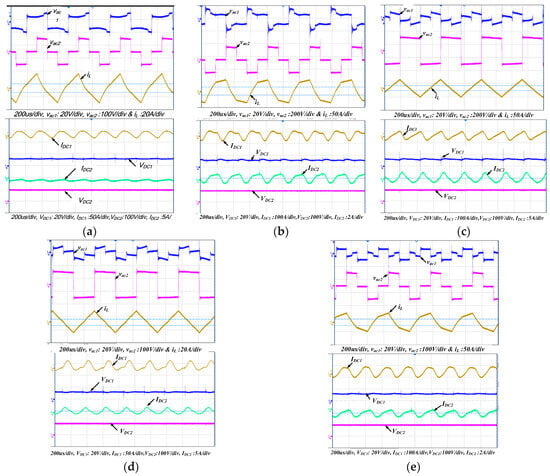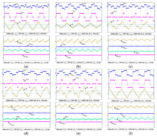 Figure 17. 0.25 pu reference power, AC and DC waveforms when Rv = 2: (a) mode 1; (b) mode 1′; (c) mode 2; (d) mode 2′; (e) mode 3; (f) mode 4.