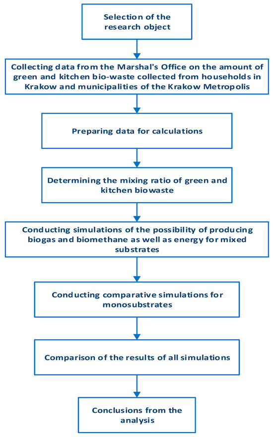 The technological process of biogas production will be based on anaerobic fermentation of green and kitchen biowaste collected in households. The collected waste will be transported to the municipal biogas plant, where it will be subjected to further preparatory activities. Silos will be built to store green biowaste at the biogas plant, where silage will be produced. The placed raw material will be covered with foil until consumed by the biogas plant. The leachate will be used to dilute the raw materials before feeding them into the digester. Kitchen waste will be regularly delivered to the biogas plant and unloaded into a silo or on a silo plate for direct use in the process. Green biowaste silage and kitchen biowaste will be mixed in a ratio of approximately 3:1, systematically introduced to a storage tank equipped with a solid substrate dispenser, and then transferred to the fermentation chamber. The storage tank will be loaded several times a day. After fermentation, the biomass will be pumped to the digestate storage tank. The biogas produced in the methane fermentation process will be collected in a biogas tank located above the fermentation chamber. The tanks will be equipped with fill level indicators and security systems ensuring operational safety. Biogas will be pumped to the cogeneration system, where the combustion process will generate electricity to be sold to individual or collective customers. The waste heat energy can be transferred to the local or municipal heating network. In the event of a failure of the cogeneration engine, any surplus biogas will be burned in an emergency biogas flare. The research methodologies are also presented in Figure 1.