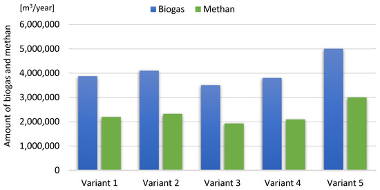 The simulation results (Table 5 and Figure 4 and Figure 5) show that the largest amount of biogas and methane, about 5 million m3/tons, will be generated if only kitchen waste is used as a substrate (Variant 5). From this substrate, the most m3 of biogas can be obtained from 1 ton of fresh mass (see Table 5). The smallest amount of biogas was produced from green waste (Variant 3), of about 3.5 million tons. The amount of biogas produced from silage (Variant 4) was lower than in Variant 1 and Variant 2, but the difference was relatively small and amounted to 2–5%.
