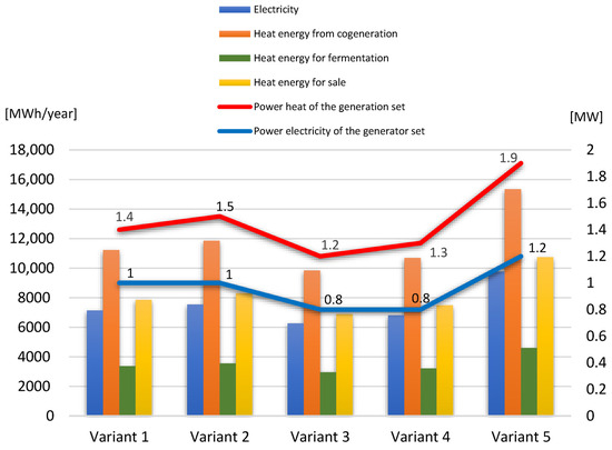 Figure 5. The amount of electricity and heat generated from biogas for five variants of substrates.