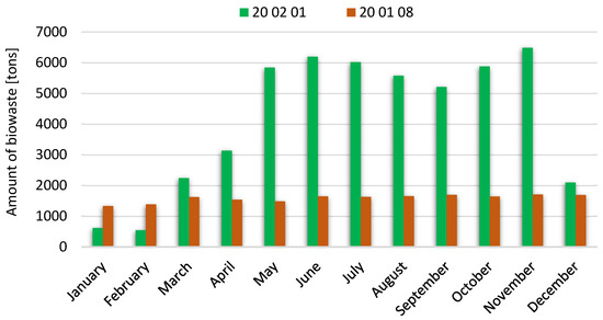 Two fractions of biodegradable waste are generated in households, i.e., biodegradable kitchen waste (code 20 01 08) and biodegradable green waste (code 20 02 01). Kitchen waste is organic waste generated at home from vegetable and fruit remains (peelings, spoiled fruits and vegetables, etc.), food remains (without meat and bones), coffee and tea grounds, egg shells, groats, pasta, and rice. The waste fraction of biowaste is green waste from home gardens, i.e., grass, leaves, flowers and their stems, branches, etc. Both types of waste (except branches) are collected by their producers into brown bags or containers of the same color and are collected by companies collecting mixed municipal waste [41,42]. The branches are transported by waste producers to selective collection points for municipal waste (PSZOK) and placed in containers. The amount of biodegradable waste collected from households in Krakow and the communes of the Krakow Metropolis is presented in Table 1.