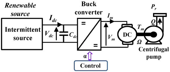 A preliminary qualitative steady state analysis of the overall system operation is first needed to understand the energy transfers in the system and its input impedance. It facilitates the conversion system understanding in order to determine the management of all Degrees of Freedom (DOF), which is really useful for the development of power management strategies. In order to make easier the qualitative steady state analysis, a simplified topology only comprising a unique centrifugal pump powered by a DC machine directly coupled to the bus via a DC–DC buck chopper is shown in Figure 2. In fact, the actual system consisting of a Field Oriented Controlled induction machine allows for decoupling the flux and the torque, which makes it quite equivalent to a DC machine for which the magnetic flux is imposed by a motor inductor while its torque is controlled by the induced current. In the same way, to simplify the analysis, losses (resistive effects) in the system are neglected in that qualitative steady state analysis.