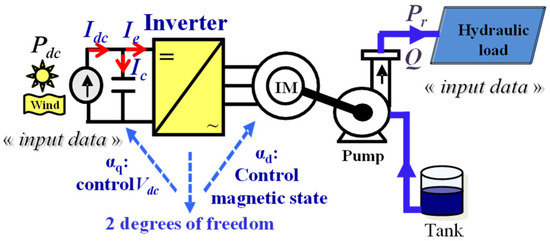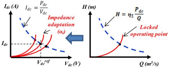 Contrarily, in our “storageless” case, the electric power delivered by the hybrid renewable sources operating in MPPT mode is fully transmitted (excluding losses) through the static converter to the pump unit via the DC bus. In this particular case, the power consumption is imposed (locked) by the hybrid sources given the hydraulic load characteristic, which here is the quadratic impedance of Equation (10). In that case, the hydraulic characteristic derived in Equation (1) has a quadratic shape as illustrated in Figure 3 (right part). Thus, given the renewable source power (Pdc), the intersection between the source (blue line in Figure 3—right part) and the load characteristic (red line in Figure 3—right part) constitute the unique operating point in the hydraulic plan (i.e., the Pr,Q plan), which is locked at a single operating point imposed at the curve crossing.