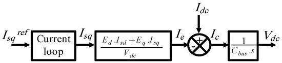 The transfer model between the DC bus capacitor and the q-axis induction machine current (i.e., the “torque current”) is represented by the diagram shown in Figure 5.