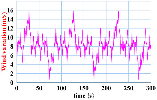 Simulations of the proposed control strategies are conducted by using 20-sim software [29] based on bond graph modeling. The details of the modeling of different elements of the power conversion chain (from the source to the hydro mechanical load) are presented in previous works [27,28]. The DC bus capacitor is pre-charged to 250 V. In order to previously simplify the analysis, we have chosen to operate the PV generator at constant power and the wind turbine generator at variable wind to highlight the dynamic performance. In this study, the authors investigate the impact of the produced power of a hybrid wind–photovoltaic source as an intermittent power source to feed a water pumping system. Nevertheless, as wind speed fluctuations might happen more quickly than the shading effects felt by solar systems, we have chosen a variable wind and a constant irradiation for the hybrid PV–wind emulator in order to evaluate the effectiveness of the control system built. The wind model is function of time as determined by the sum of several harmonics given in Equation (29):