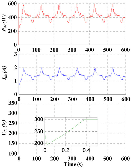 The simulation results show the dynamics and the performance of the designed control strategy. Figure 9 shows the proposed wind profile imposed on the wind turbine. The DC power (Pdc) and current (Idc), as well as the DC voltage (Vdc) controlled by the FOC strategy are depicted in Figure 10. As shown in this figure, the DC power follows the wind variations. However, the input power variation is filtered by the large inertia of the wind turbine. The DC voltage is kept constant by the FOC Controller and set to the reference (Vdcref = 300 V).