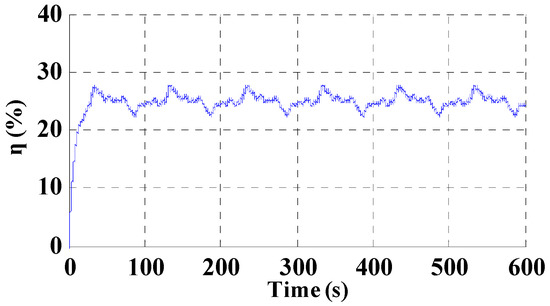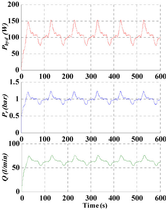 Figure 17 confirms that, given the hydraulic load, the pressure and flow variables follow the variations of the DC bus power Pdc. It can be remarked that the experimental transient behavior is fully in accordance with the corresponding simulation results presented in Figure 10, which validates both the theoretical vision in terms of power management and the transient model of the water pumping unit used in the FOC strategy. Some slight differences can be observed on the volumic flow variations (Q) between simulations of Figure 10 and experiments of Figure 17, but these shapes are qualitatively in good agreement. The same remark can be made on the system efficiency, which is very close, by comparing the simulation of Figure 12 with the global system efficiency obtained from the experiments and shown in Figure 17. The derivation of the experimental efficiency is obtained from the ratio between the hydraulic vs. the DC bus powers.