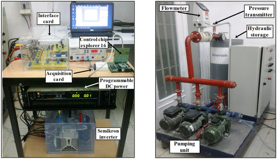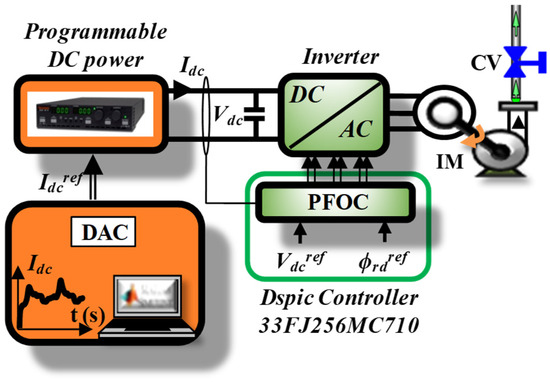 The experimental setup shown in Figure 13 and Figure 14 is composed of a programmable DC power source (DLM 4 kW from Sorensen) that emulates the hybrid renewable power sources. It also integrates a voltage source inverter (Semikron 20 kVA), a three-phase centrifugal motor pump (DAB 750 W) whose parameters are shown in Appendix A, a Dspic microcontroller which encloses the FOC, and an electronic card generating the DC current reference [30].