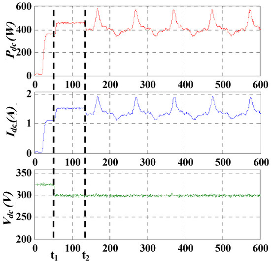 Figure 16 shows the good performance of the DC bus voltage control Vdc from the FOC strategy for variable DC power. Note that from t1 to 600 s, the DC power Pdc varies according to the reference generated by the card generation. From t2, the programmable power supply operates as a hybrid renewable source emulator. The power produced is then variable.