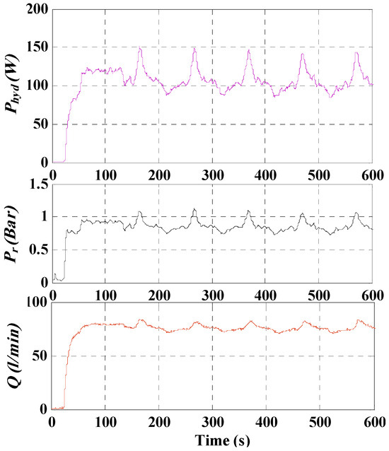 The electrical and hydraulic variables are stored on a time horizon of 600 s (10 min) to fully assess the test cycle.
