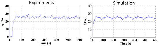 In this particular case, given the input power range and the hydraulic load characteristics, the system efficiency is slightly variable and remains constantly correct when the DC bus power Pdc is varied due to the variable winds. Figure 18, in which the simulation of Figure 12 is repeated, allows us to emphasize the accordance between simulation and experimental results, giving confidence to the system modelling.