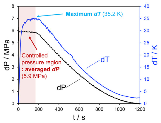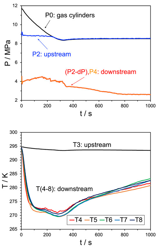 The non-hydrating experiments reported here serve as a baseline to understand the typical behavior of a given expansion test run. Given that the system is pressure-driven, the pressure differential over the valve can only be maintained while the bottle source exceeds the regulator set point. This means that there will be a period of steady state operation which generally lasts 2–10 min, followed by a steady decline in pressure drop and the corresponding JT cooling. Figure 2 shows an example of this behavior in terms of the pressure and temperature differentials, with a steady state operating period on the order of 4 min. The cooling response rate is indicated by the steep increase in the temperature differential within the first minute, which then plateaus as the test section equilibrates with expanding fluid. This maximum temperature differential during the steady-state operating period can be compared with thermodynamic property simulation tools. The dynamic data obtained thereafter are useful as an input for accompanying models of the overall flowing system for the purpose of estimating heat transfer into the flowing fluid.